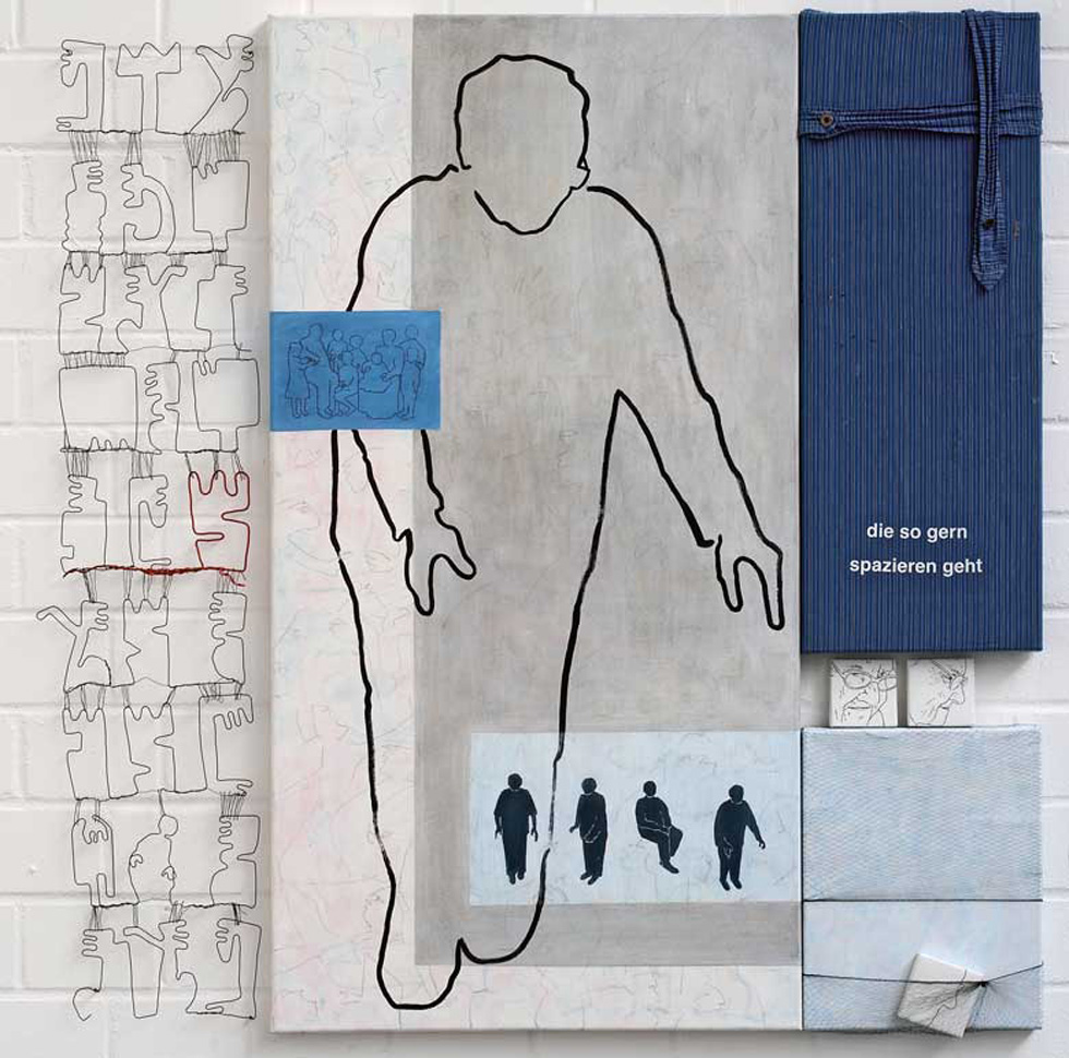 Die so gern spazieren geht, 2006 Acryl, Bleistift auf Leinwand, Schürze, Haarnetze; 135 cm x 130cm