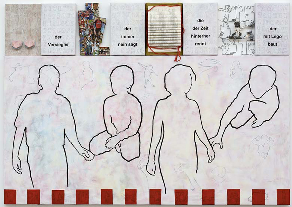 Acryl auf Leinwand, Gips, Zeitschrift, Gips, Buch, Lego; 116 cm x 160 cm