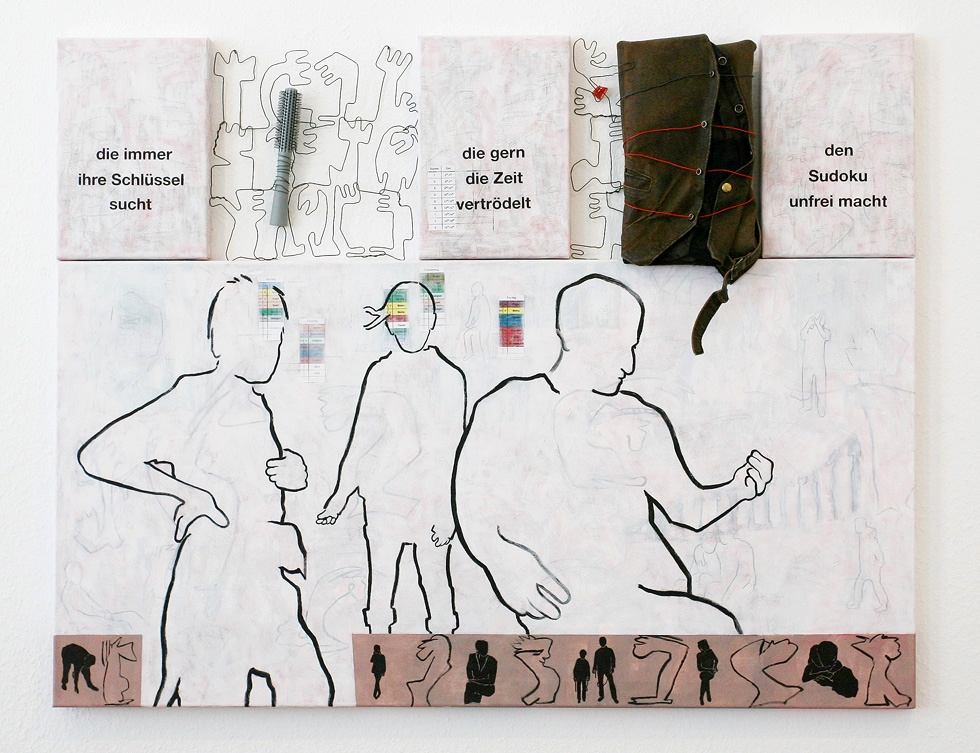Die wir im Nebel deutlich sahen, 2008 Acryl auf Leinwand, Farbkopie, Weste, Bürste, Draht; 135 cm x 116 cm