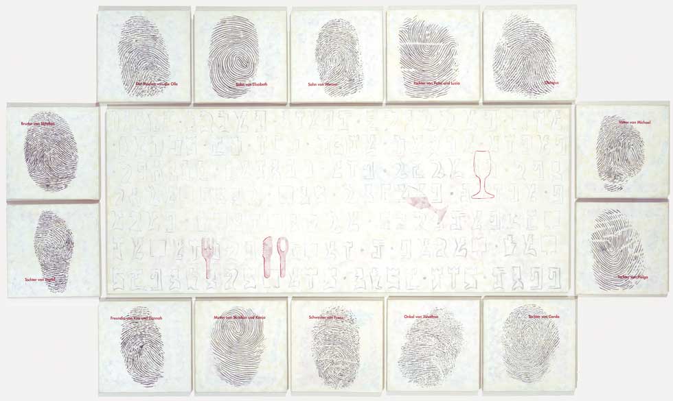 Acryl, Wachskreide auf Leinwand, 15-teilig; 146 cm x 286 cm
